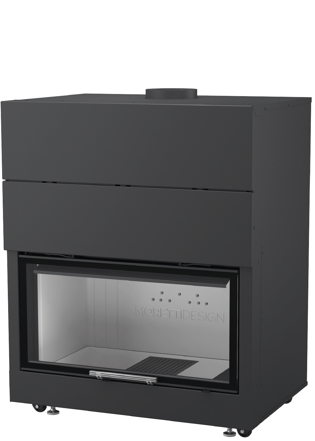Focolare ad aria con frontale da 90 cm. Lo stile è identificato dalla PORTA FRONTALE SOLO VETRO che esalta la fiamma e il refrattario bianco illumina la camera di combustione. La semplicità di utilizzo è garantita dalla DOPPIA APERTURA della porta, a saliscendi per il carico della legna ed a bascula per facilitare la pulizia. La DOPPIA COMBUSTIONE ne aumenta il rendimento e il PASSAGGIO ARIA COMBURENTE mantiene pulito più a lungo il vetro frontale. Come optional si può avere il kit di canalizzazione per estendere la funzionalità di riscaldamento con motore super prestante da 700 m³/h canalizzabile fino a quattro stanze.