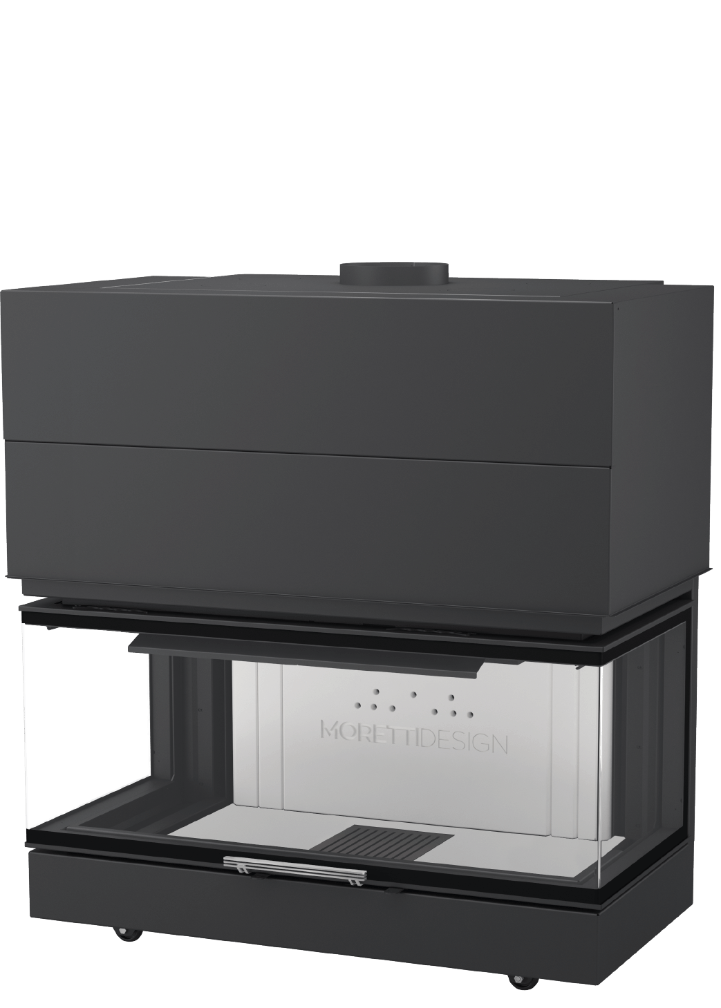 Focolare ad aria con frontale a tre lati. Lo stile è identificato dalla grande PORTA FRONTALE che esalta la fiamma, dal bianco che illumina la camera di combustione e dalla particolare forma della porta che permette di apprezzare la fiamma da tre lati differenti. La semplicità di utilizzo è garantita dalla DOPPIA APERTURA della porta a saliscendi per il carico della legna e laterale per facilitare la pulizia. La DOPPIA COMBUSTIONE ne aumenta il rendimento e il PASSAGGIO ARIA COMBURENTE mantiene pulito più a lungo il vetro frontale, col DEFLETTORE FUMI REGOLABILE che modula il tiraggio. Come optional si può avere il kit di canalizzazione per estendere la funzionalità di riscaldamento.