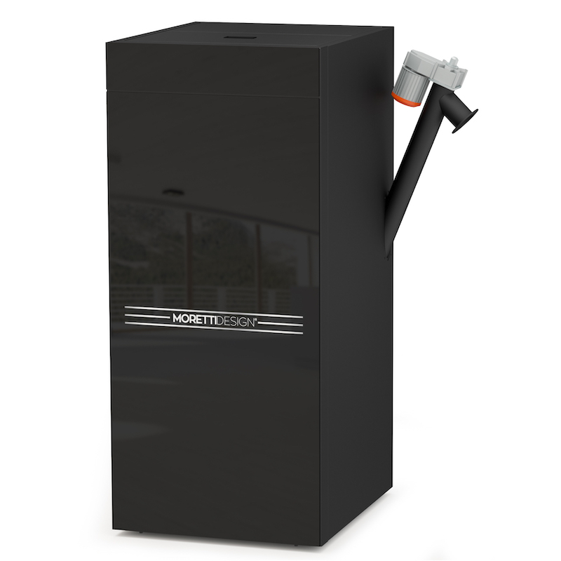 Unico ed elegante serbatoio con sistema di apertura dei sacchi di pellet brevettato da MORETTI DESIGN.